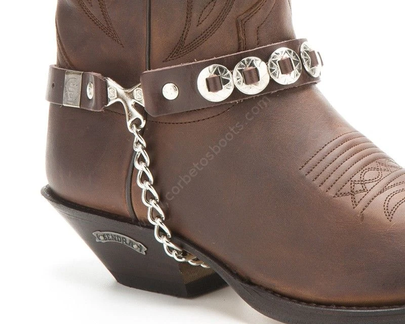 - Haz que tus botas marrones o de tonos oscuros sean todavía más impresionantes gracias a estos arneses decorativos Sendra con conchos redondos brillantes y un pasado de cuero en el centro que fija y adorna cada pieza. Sentirás que tus botas se transforman por completo.
