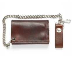 - Accede con un simple gesto y de forma segura a todo aquello que sueles llevar contigo a diario con esta fantástica cartera lisa de piel de vacuno color marrón coñac envejecido con cadena, para anclar en la trabilla del pantalón o tu cinturón. Este modelo destaca por no llevar corchetes en la parte frontal, evitando así cualquier tipo de fricción en el bolsillo.
