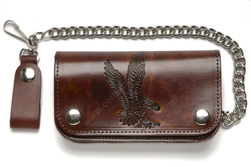 Cartera Motorista Mediana Con Cadena Piel Envejecida Marrón Con águila Grabada