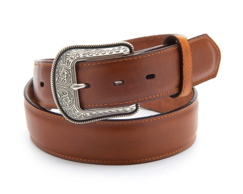- Cinturón de vestir para hombre, hecho con cuero marrón coñac encerado y ligeramente oscurecido, doble montado de piel en la parte frontal, pespunte decorativo en hilo anaranjado y hebilla plateada de aguja con grabado estilo western de gran detalle y calidad.