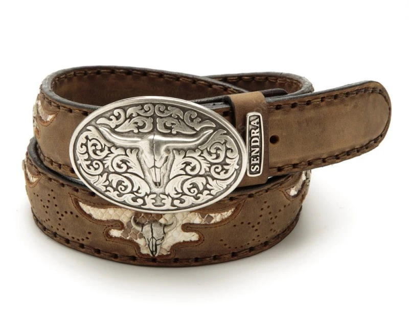 - El cinturón que todo cowboy quiere tener: este clásico de Sendra Boots vuelve a renovarse con una fantástica combinación hecha en piel de vacuno color marrón y auténtica piel de pitón color blanco / marrón, imitando la forma de una calavera de vaca.