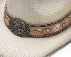 Sombrero Cowgirl Paja Rígida Natural Para Mujer Con Dibujo Floral Cosido Y Grabado En Cuero
