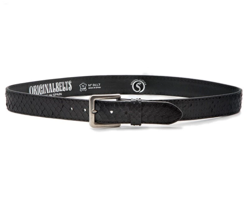 - Cinturón para hombre y mujer Original Belts hecho con doble capa superpuesta de cuero vacuno y capa exterior cosida de lomo de piel de pitón negro, con trabilla a juego y hebilla metálica clásica de aguja.