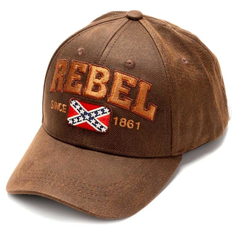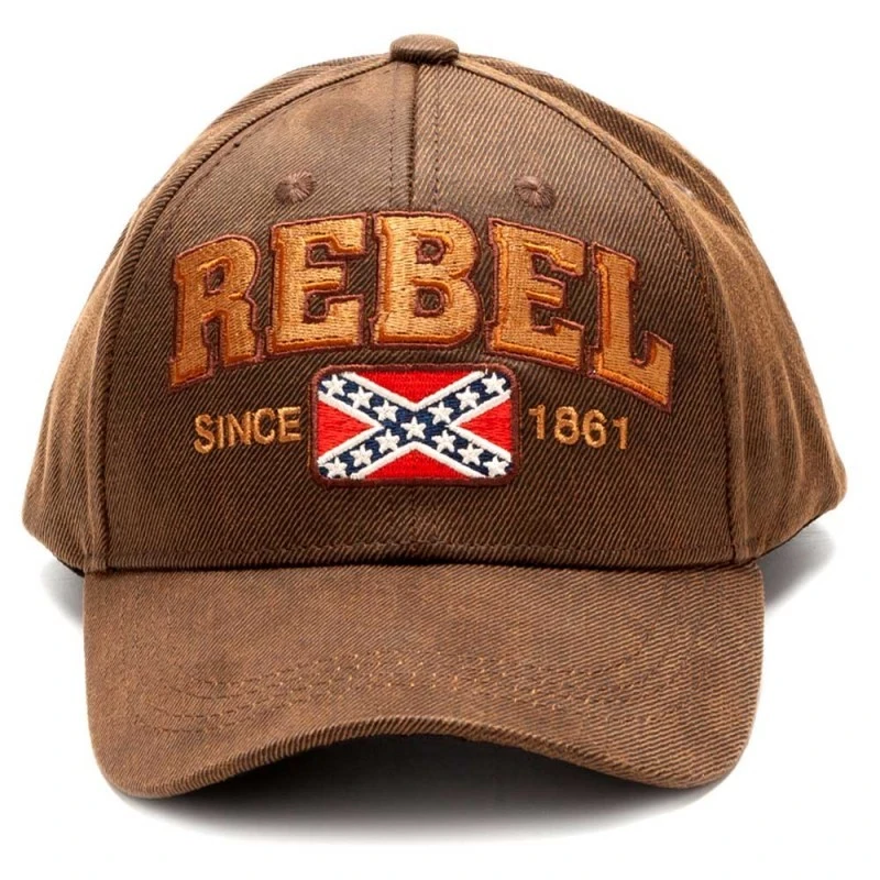 - Gorra beisbol marrón oilskin confederada con Bandera Dixie y la frase «Rebel Since 1861» bordados para dar un aspecto 3d a estos diseños frontales. El material de la gorra tiene un acabado que busca asemejarse al cuero aunque incluso al tacto podría bien dar una sensación aterciopelada. Sobria y con colores muy combinables, es la opción ideal para complementar tu outfit Dixie