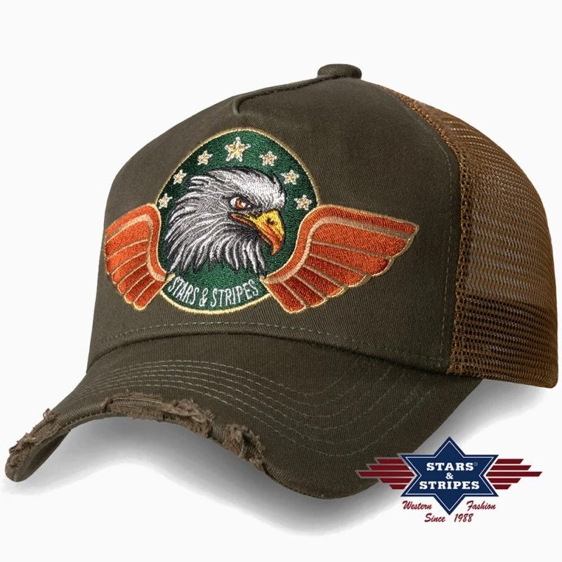 - Ponte lo mejor de la moda más actual con un genuino toque motero con la colección de gorras cowboy americanas Stars & Stripes para hombre y mujer, con diseños puramente biker bordados en el frontal con colores intensos, como el de esta cabeza de águila en un fondo redondo verde alado con estrellas y el branding de la marca también inscrito.