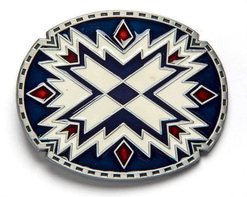 - El toque western se lo darás seguro a tu cinturón, colocando esta fantástica hebilla esmaltada de inspiración nativo americana, con un clásico mosaico navajo en cruz que combina azul, blanco y rojo.