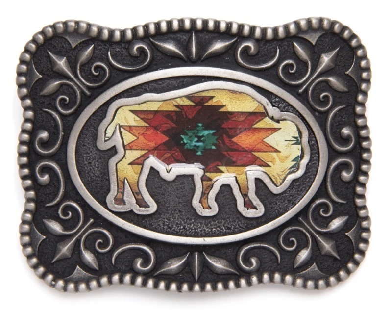 - Hebilla western rectangular de aspecto envejecido y ligeramente ondulada para hombre y mujer, decorada en el centro con la figura de un bisonte de perfil, cuyo interior contiene un vistoso mosaico de estilo azteca en colores vivos. El contorno exterior metálico está adornado con relieves en forma de flor de lis.