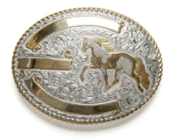 Hebilla Vaquera Chapada En Plata Y Bronce Crumrine Con Caballo Trotando