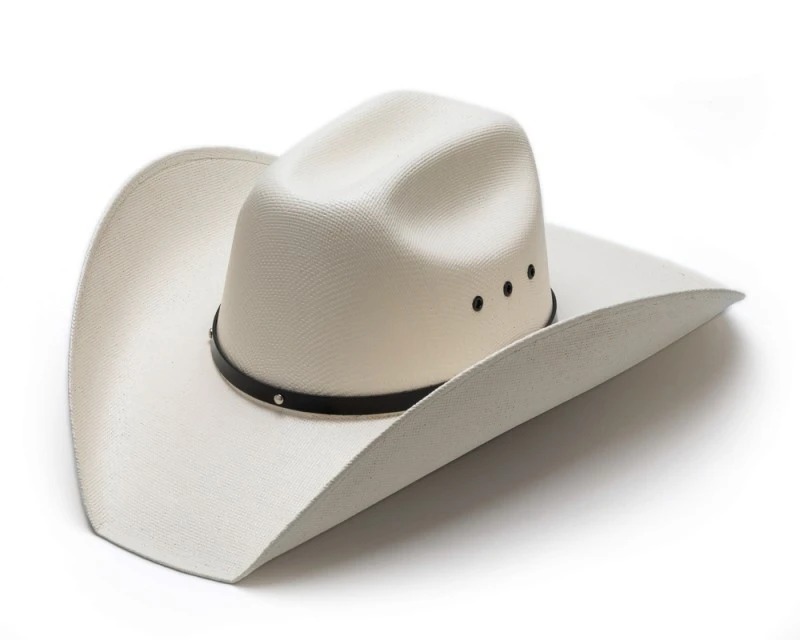 - Sombrero cowboy blanco edición limitada Justin Moore de Bullhide Hats para hombre y mujer, de copa Cattleman baja con ojales negros, hecho con paja endurecida real calidad 50X y cuatro capas de esmaltado que le confieren, además de la blancura acentuada, una gran durabilidad y resistencia a todos los elementos. La cinta decorativa de cuero negro está barnizada y adornada con varios conchos redondos y una pequeña placa metálica en el costado izquierdo con el nombre grabado de dicho cantante country.