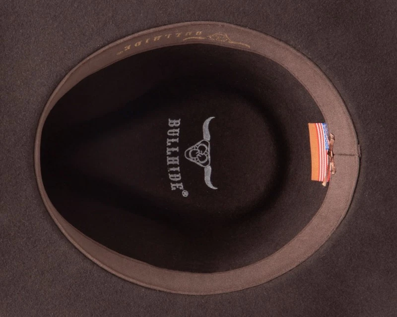- Sombrero cowboy marrón oscuro hecho con fieltro de lana de ala corta curvada y copa Pinch para hombre y mujer marca Bullhide Hats, decorado con una amplia cinta de cuero marrón a juego con varios abalorios engarzados en la parte frontal que combinan cuentas azules de aspecto tallado y embellecedores en latón envejecido. También muestra una pequeña hebilla en tono oro viejo con muescas pintadas en azul claro y un pasado de cuero central en el mismo tono.