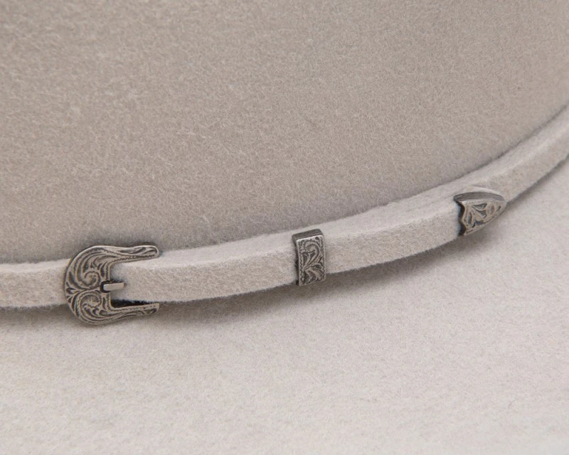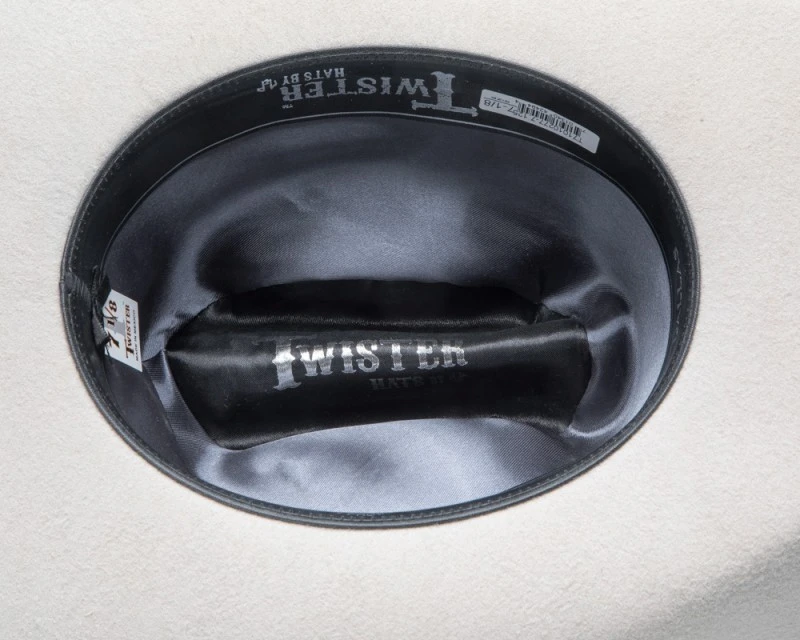 - Sombrero western color «Silver Belly» (se puede percibir entre el blanco crudo y el gris claro) de ala ancha y copa Cattleman, hecho 100% con fieltro de lana, de la marca Twister Hats para hombre y mujer.